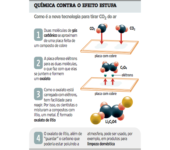 “Um novo dispositivo apresentado nesta quinta-feira (14) por cientistas pode um dia se tornar uma máquina para salvar o planeta do aquecimento global: ele tira o dióxido de carbono (CO2) do ar e o transforma em compostos de carbono que podem ser vendidos como matéria-prima à indústria“.