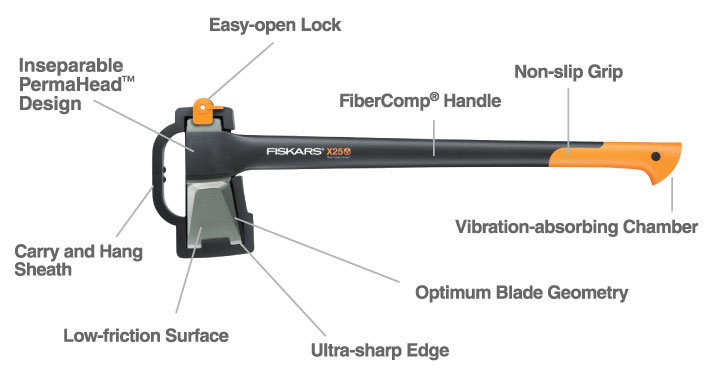 Fig. 1 – Ao lado, o machado Fiskar da Série X, de cabo oco em fibra de carbono, um dos muitos modelos comercializados pela empresa ( http://www2.fiskars.com/Products/Yard-and-Garden/Axes-and-Striking. Veja, nesta mesma página, o filme completo sobre esta excelente e premiada ferramenta, embora tão simples.