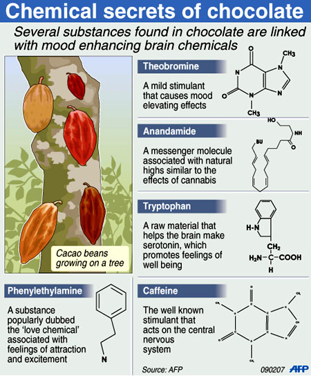 Além de possuir substâncias capazes de afetar e condicionar o funcionamento do cérebro, alguns dos componentes químicos do chocolate estão presentes em outros alimentos, permitindo sua combinação e ajuste ao paladar. Veja abaixo diversos componentes que entram na composição do produto, e escolha outros produtos com alguns destes componentes na fórmula para efetuar combinações que podem ser patenteadas. Consulte o artigo de Simon Dewulf mencionado no post anterior.